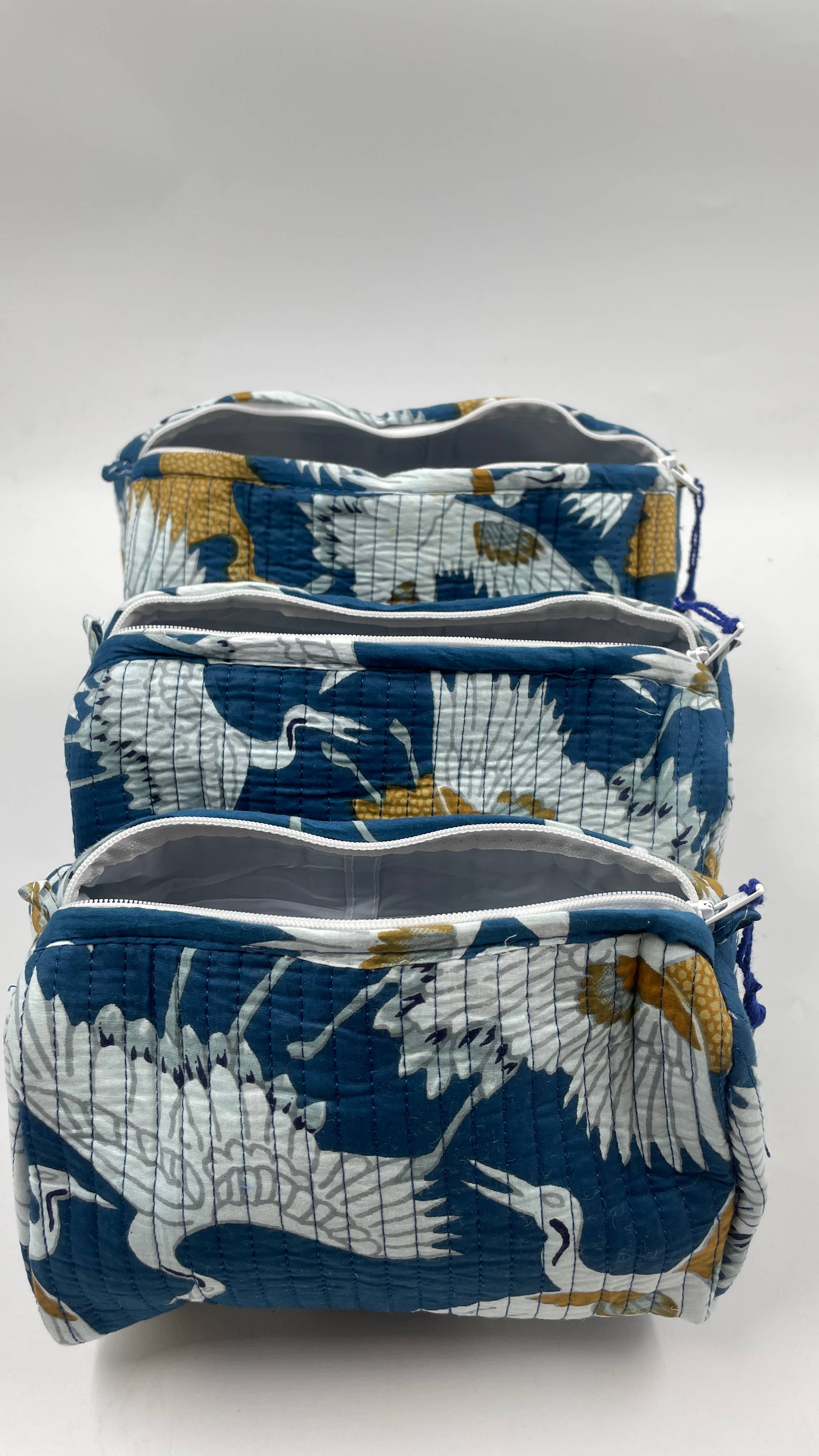 White Crane set of 3 cotton quilted wash bags