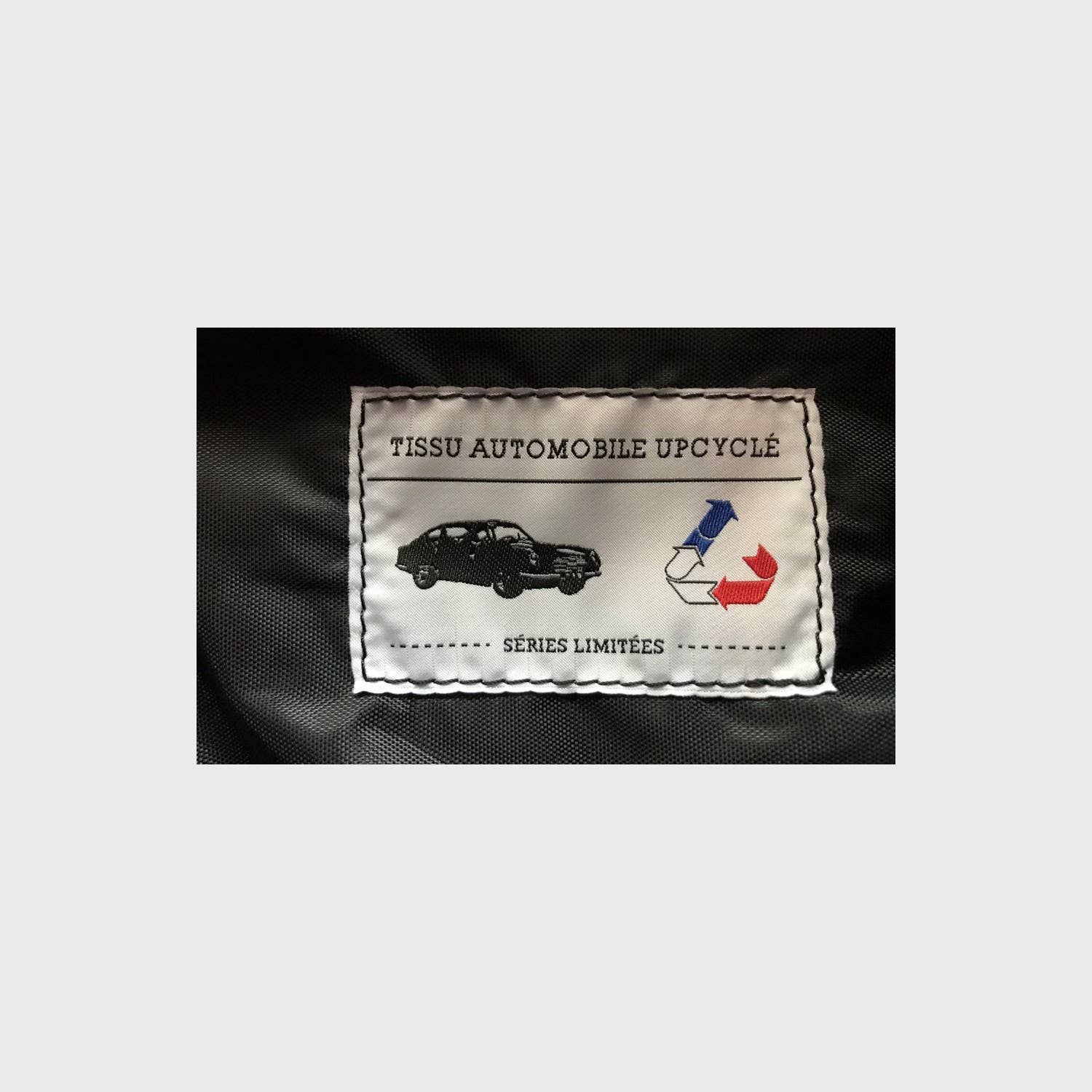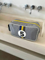 Men's toiletry bag made from upcycled automotive fabric, leather and seat belt.