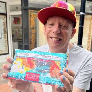 An adventure for the taste buds, this aromatic dark chocolate bar with smoky crunch, finishes with a sweet maple syrup taste. Made in the UK with responsibly sourced single origin cocoa, wrapped in coloured foil & encased in a recyclable envelope, this bar features artist David Bell’s original Adventurous artwork presented in a dazzling turquoise frame. An ideal gift for chocoholics, art lovers & good-cause supporters everywhere!