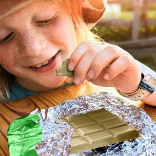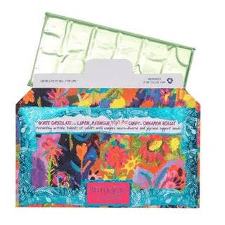 A creamy white chocolate bar with crunchy meringue & warm cinnamon biscuit, followed by a tang of lemon & finished with a burst of popping candy joy! Made in the UK with responsibly sourced cocoa, wrapped in coloured foil & encased in a recyclable envelope, this bar features artist Sarah Harbott’s original artwork presented in a dazzling turquoise frame. An ideal gift for chocoholics, art lovers & good-cause supporters everywhere!