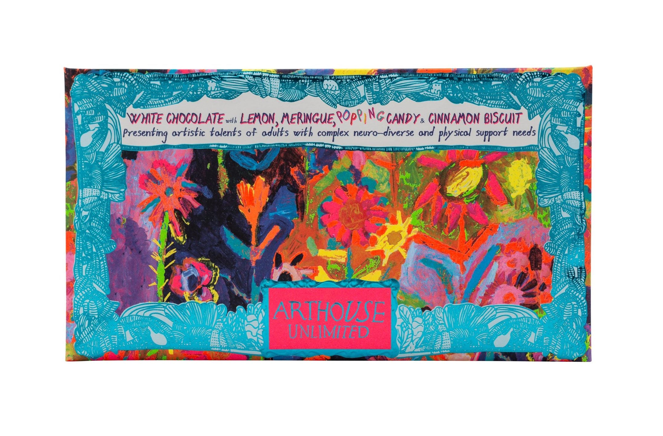 Ingredients: Sunflowers in the Hill,  White Chocolate Bar With, Lemon Meringue, Popping Candy & Cinnamon Biscuit. Featuring artwork from ARTHOUSE Unlimited artist Sarah Harbott sat in a dazzling blue frame. This chocolate is made in the UK with ethically sourced, sustainable cocoa. Wrapped in recyclable foil and encased in a reusable & recycleable envelope. Please store in a cool, dry place away from direct sunlight. Min 85g.