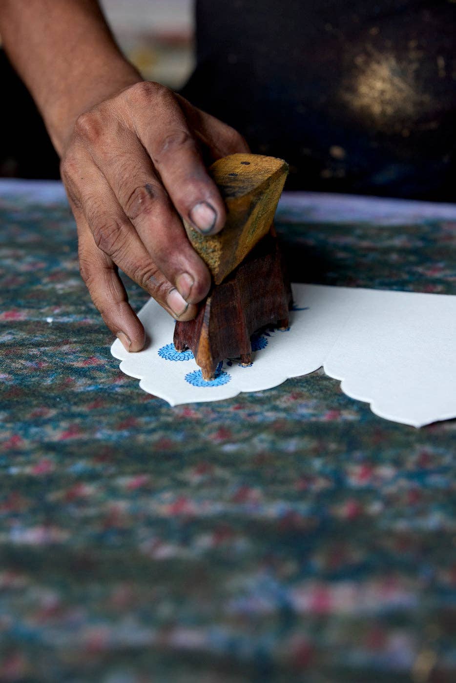 Each set features 6 beautiful, die-cut notecards and envelopes, handcrafted by artisans in India, using traditional techniques of wood block printing and hand marbling.