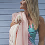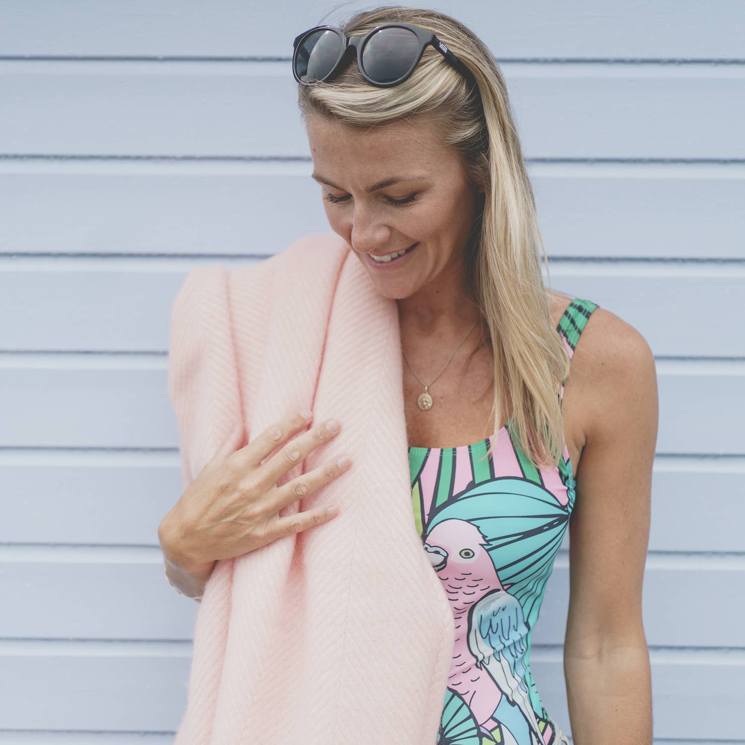 Pull our candy floss pink herringbone blanket over your shoulders from a clifftop perch or the cradle of your favourite chair and relax into its enveloping folds.