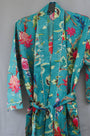 Cotton Kimono Dressing Gown Robe -Emerald Green Botanical