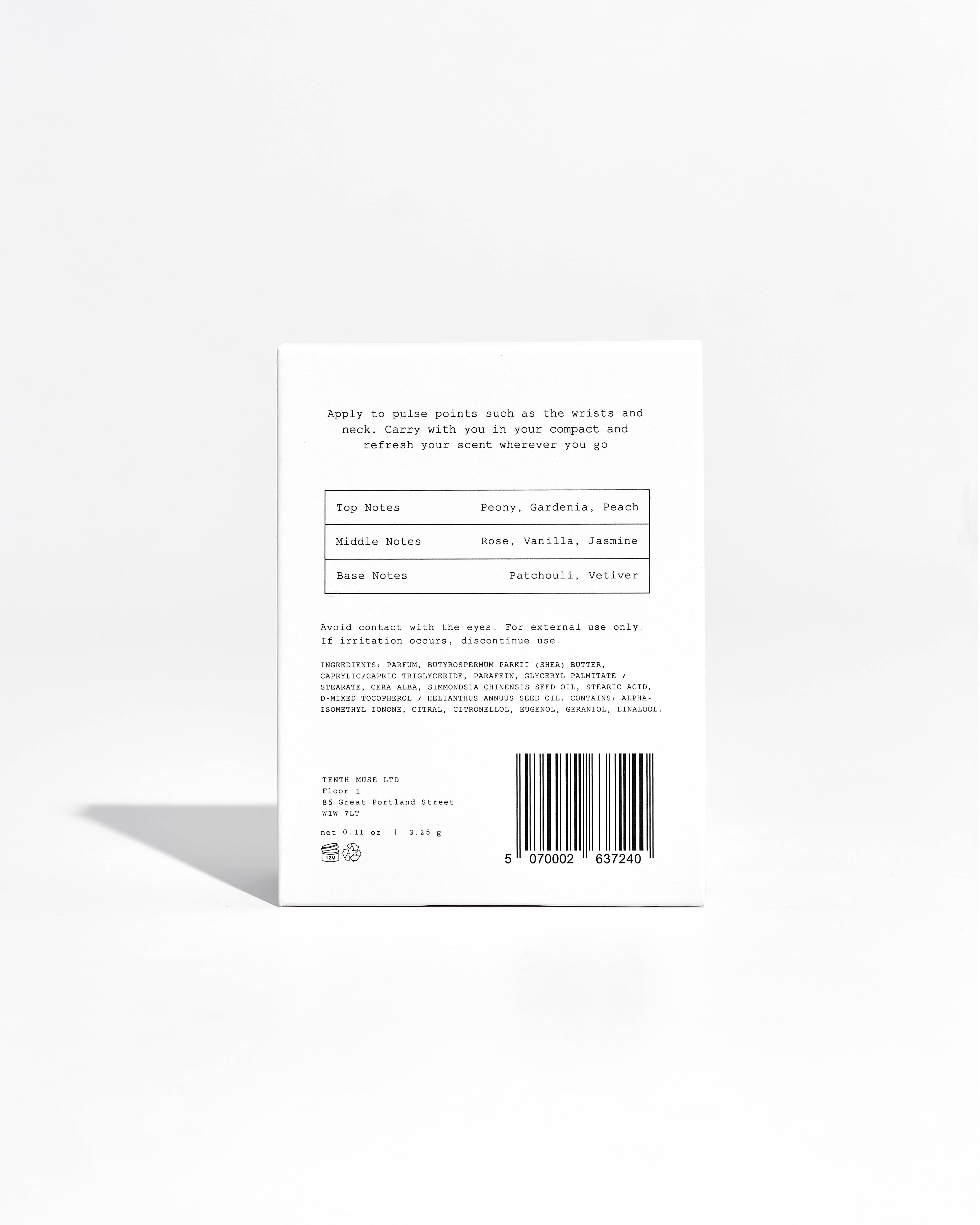 A captivating blend of fruity and floral notes, with a subtle hint of spice that makes you feel magnetic, confident, and alluring. Perfect for a romantic date or any time you want to feel special. With top notes of peony, gardenia, and peach; middle notes of rose, vanilla, and jasmine and base notes of patchouli and vetiver. Simply warm the perfume up with your fingertips and apply to your wrist and neck for a beautiful scent that lasts all day. When your scent is finished, or you just want to switch things up, our magnetic compact makes it easy to refill or mix and match fragrances. Made with shea butter, coconut oil, beeswax, vitamin E, fragrance & essential oils. Top notes: Peony, Gardenia, Peach MIddle notes: Rose, Vanilla, Jasmine Base notes: Patchouli, Vetiver
