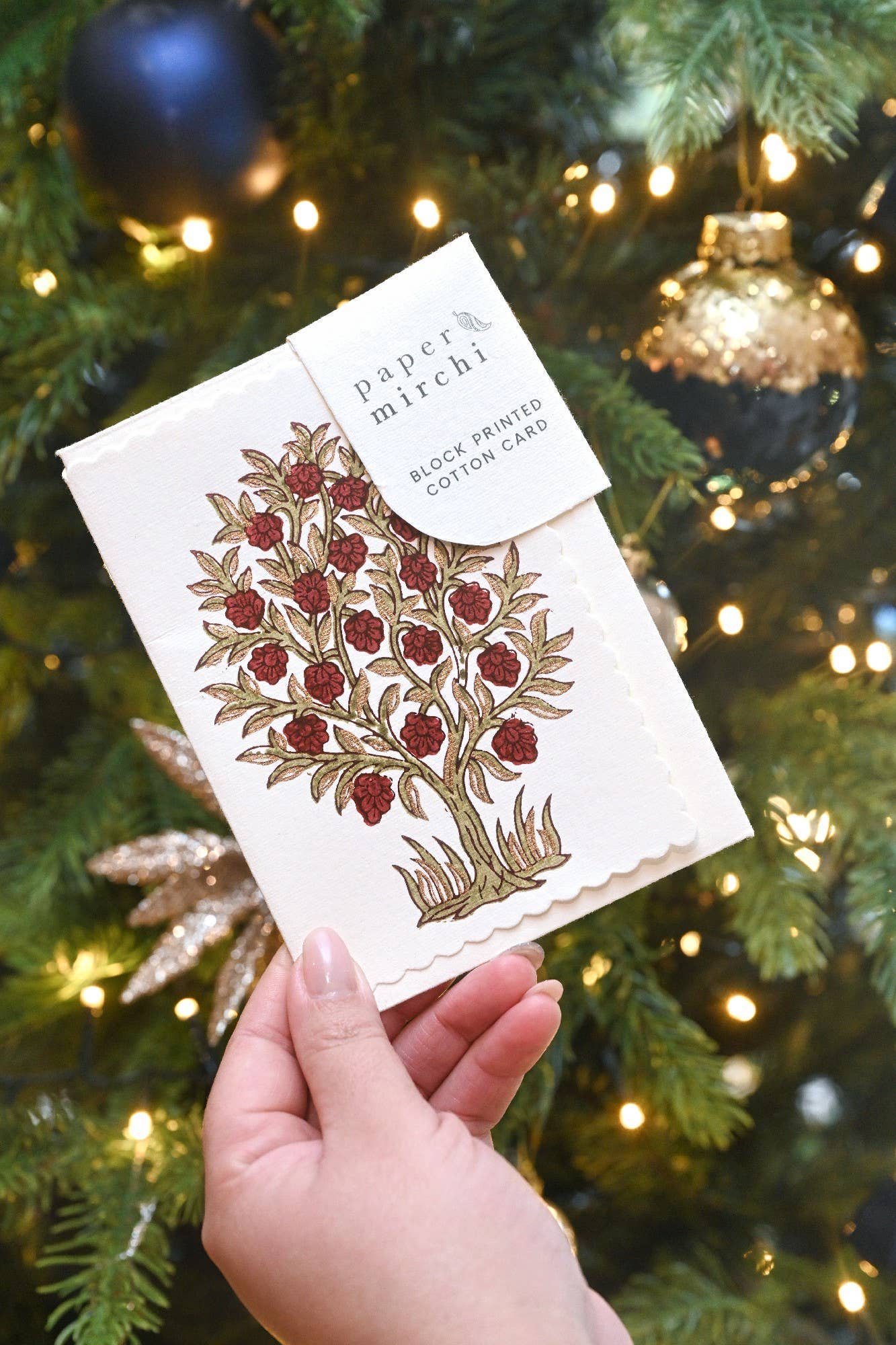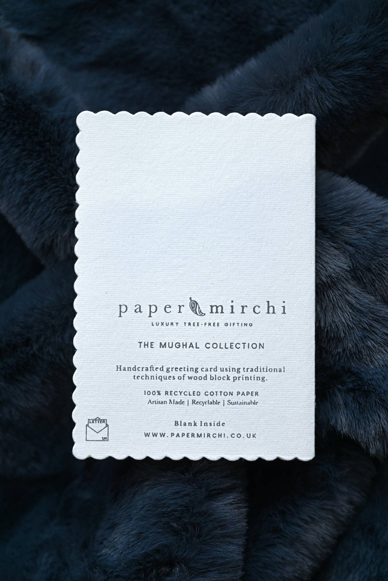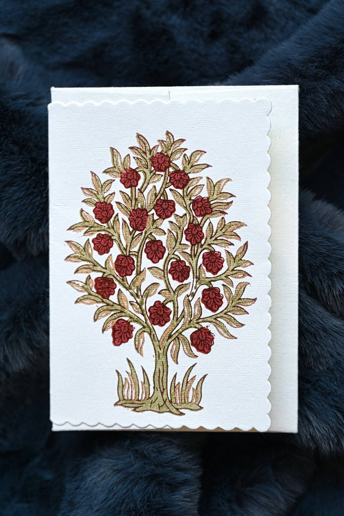 The designs are expertly hand block printed by skilled craftsmen on 100% cotton scalloped edge cards.