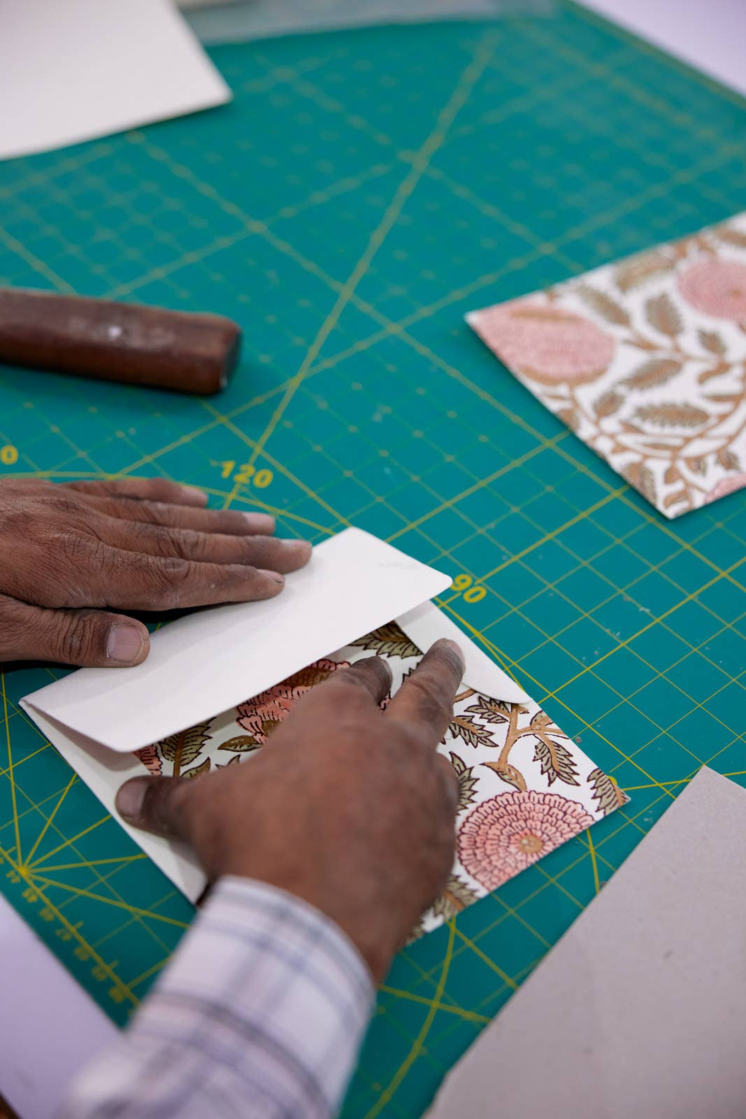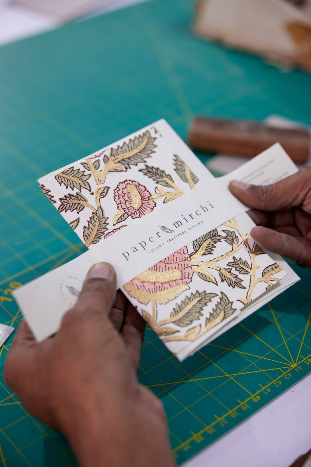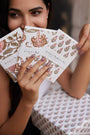 . Each card is hand block printed by a skilled artisan on luxurious tree-free 250gsm cotton cardstock and is accompanied by a luxury peel and seal envelope which is hand block printed in the matching on the reverse for understated appeal. No two cards are the same, making them truly unique. The card and envelope are neatly held together with a tree-free belly band. The card can be easily framed to become a beautiful ornament or keepsake. They are blank inside. Size A6. A6 (14.8 x 10.5cm). 100% recycled cotton paper.