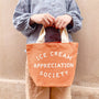 This hand illustrated 'Ice Cream Appreciation Society' design has been printed in off-white on sturdy pretty peach canvas. Made with love in the UK.