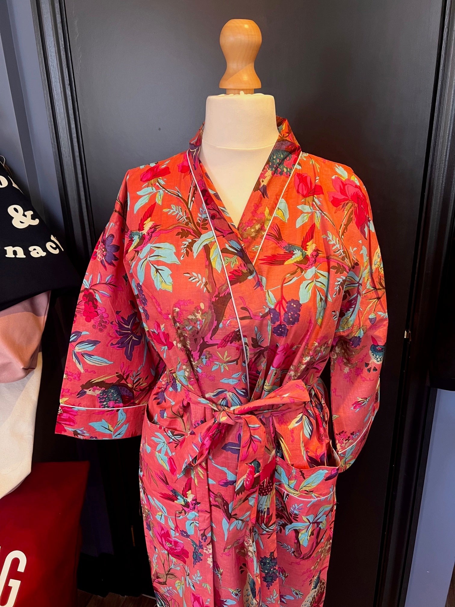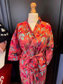 These handmade cotton kimono gowns come in a variety of colors and styles so that they'll fit any occasion. Specifications: Fabric: Hand Screen Printed Fabric Sizes: One size will fit sizes U.K 8 to 16 Length: 50 inches (127 Centimeter) Bust Around Size: 48’’ Inches Sleeves Length: 14" Inches Shoulder: 8" Inches 2 Front Side Pockets, Belt and Loops and detailed with a contrast coloured piping. Care: Cold Delicate Machine or Hand Wash Product colour may look slightly different from the picture due to the limitations of the camera and individual monitor settings.