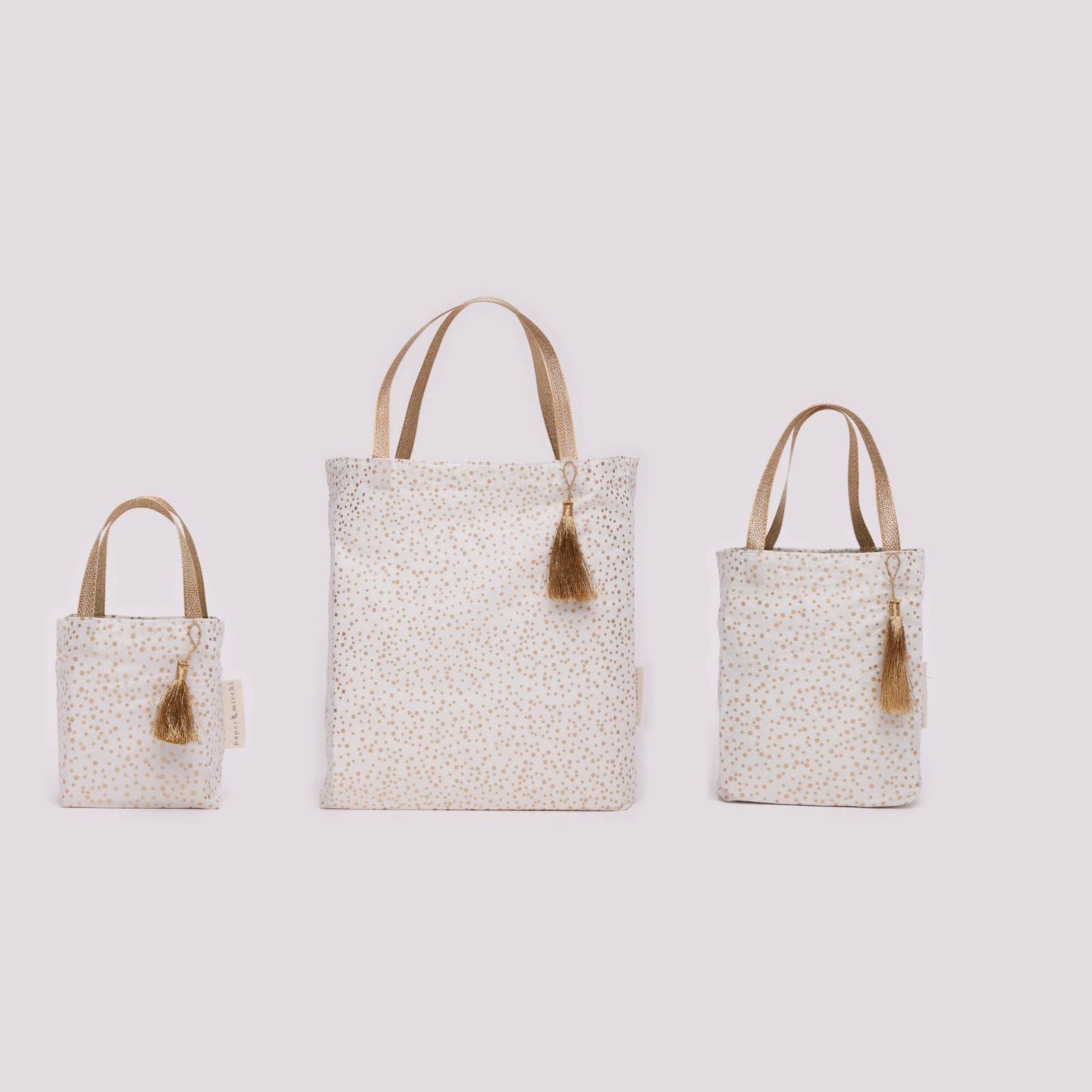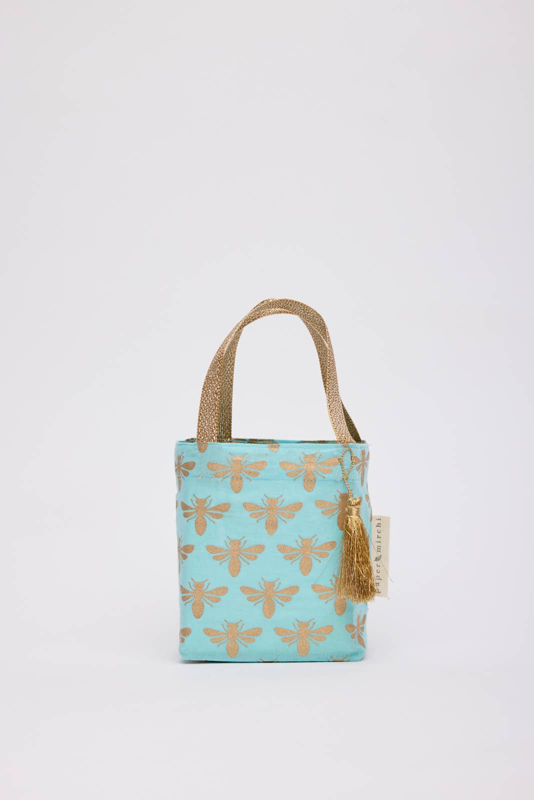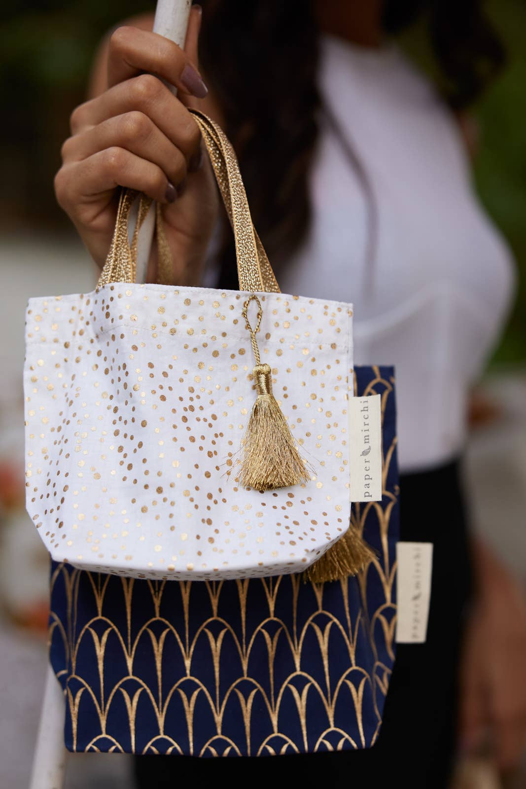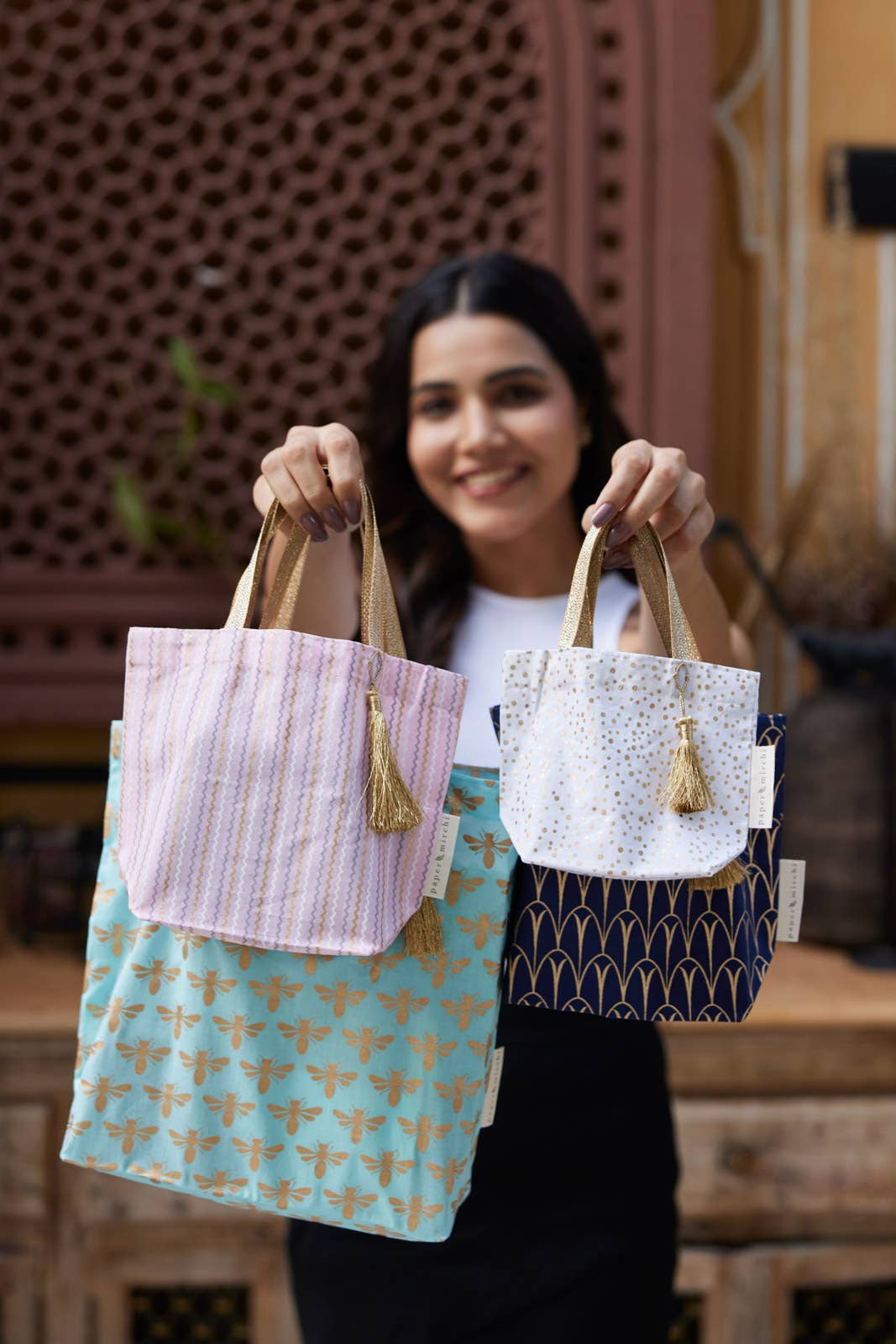 Our Luxe Gold Collection of fabric gift bags is available in a selection of Paper Mirchi exclusive designs in a variety of beautiful colours.