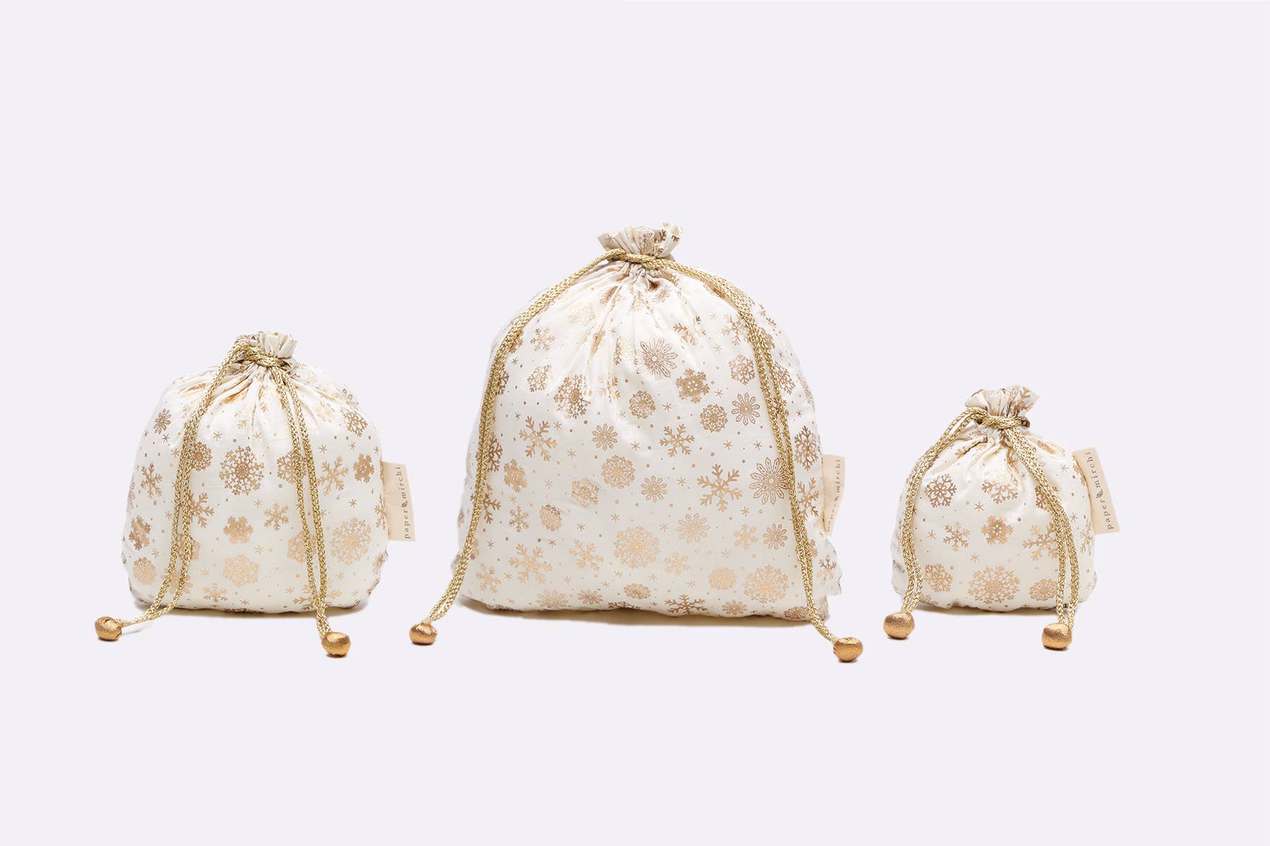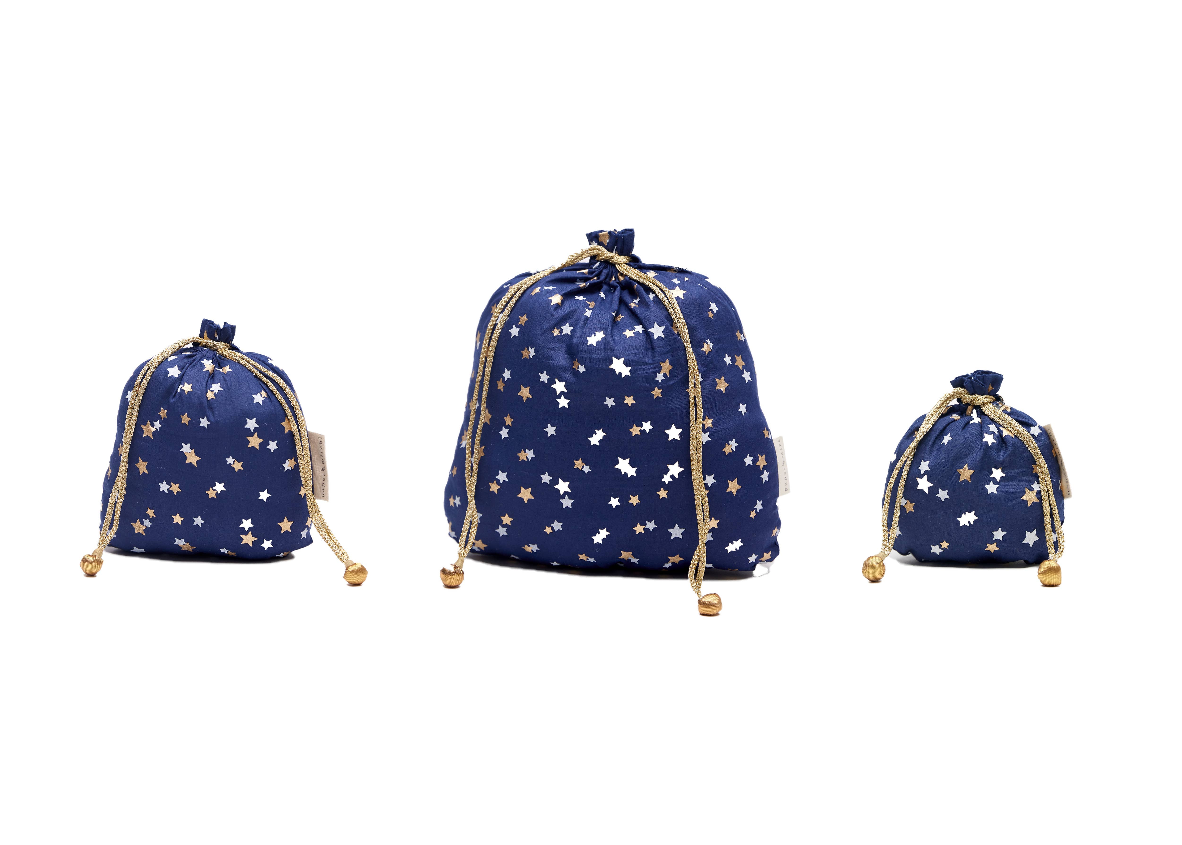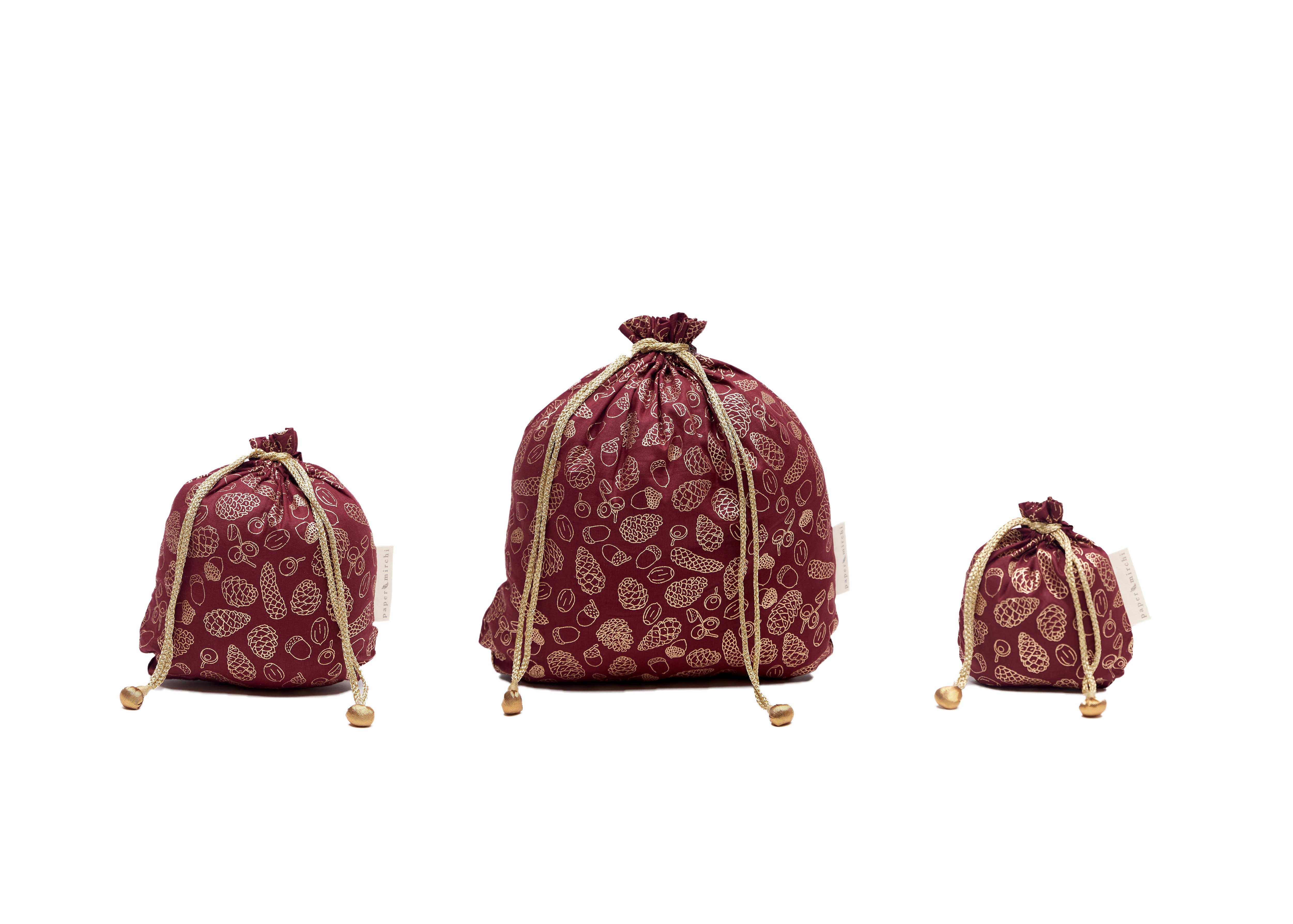 Our Christmas Collection of fabric gift bags is available in a selection of four Paper Mirchi exclusive designs in a variety of festive colours.