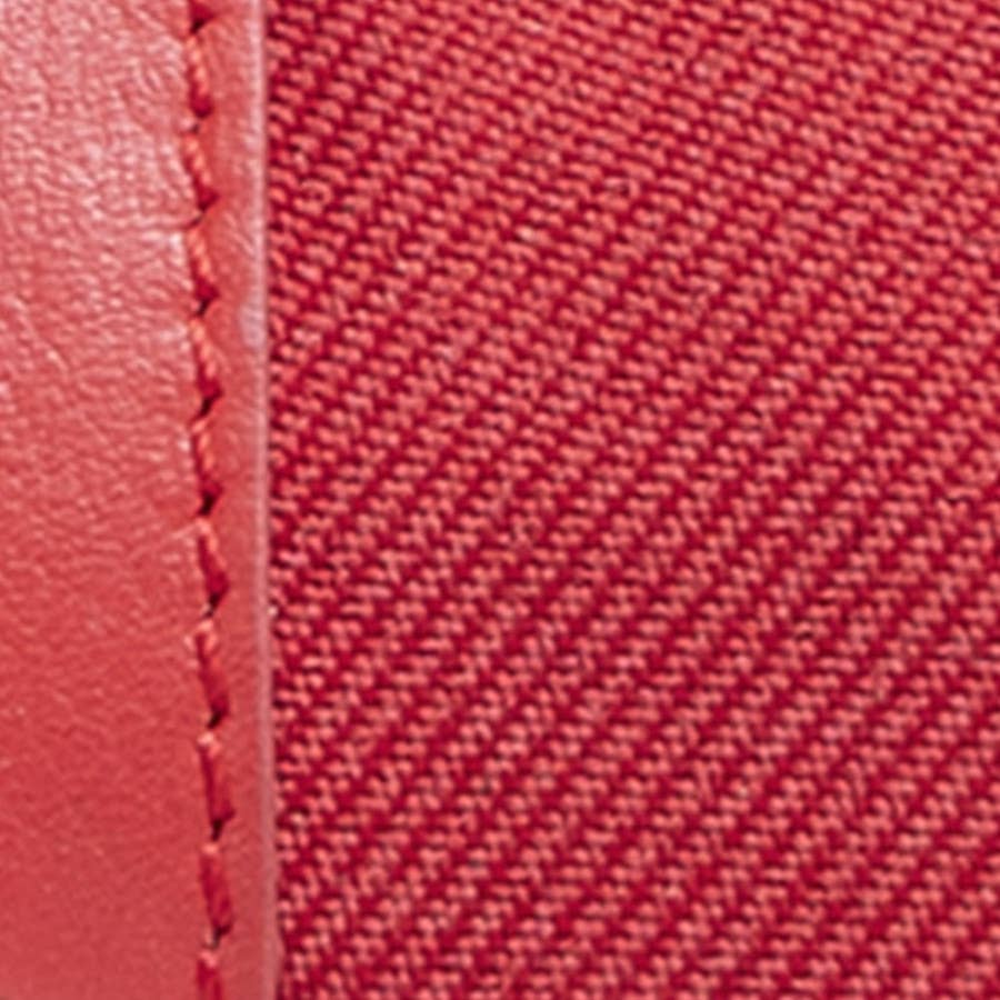 Parrot red diagonal fabric, Leather finish, White Rong: diameter 7 cm, Hand carry handle, Black spiral zip, One zipped compartment, One front pocket and one back pocket, Black waterproof lining.