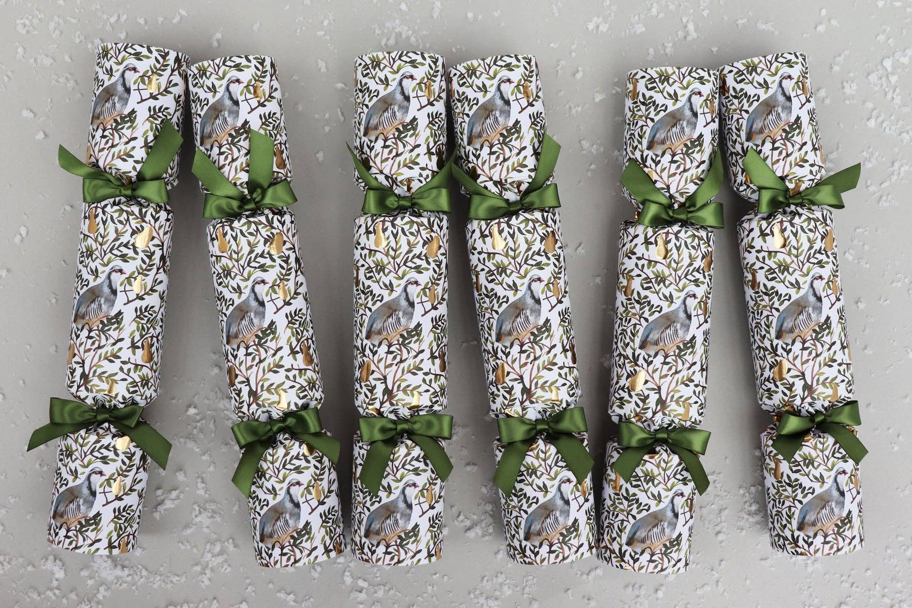 Six Luxury Christmas crackers featuring a beautiful partridge in a pear tree design, with contrasting sage bows.