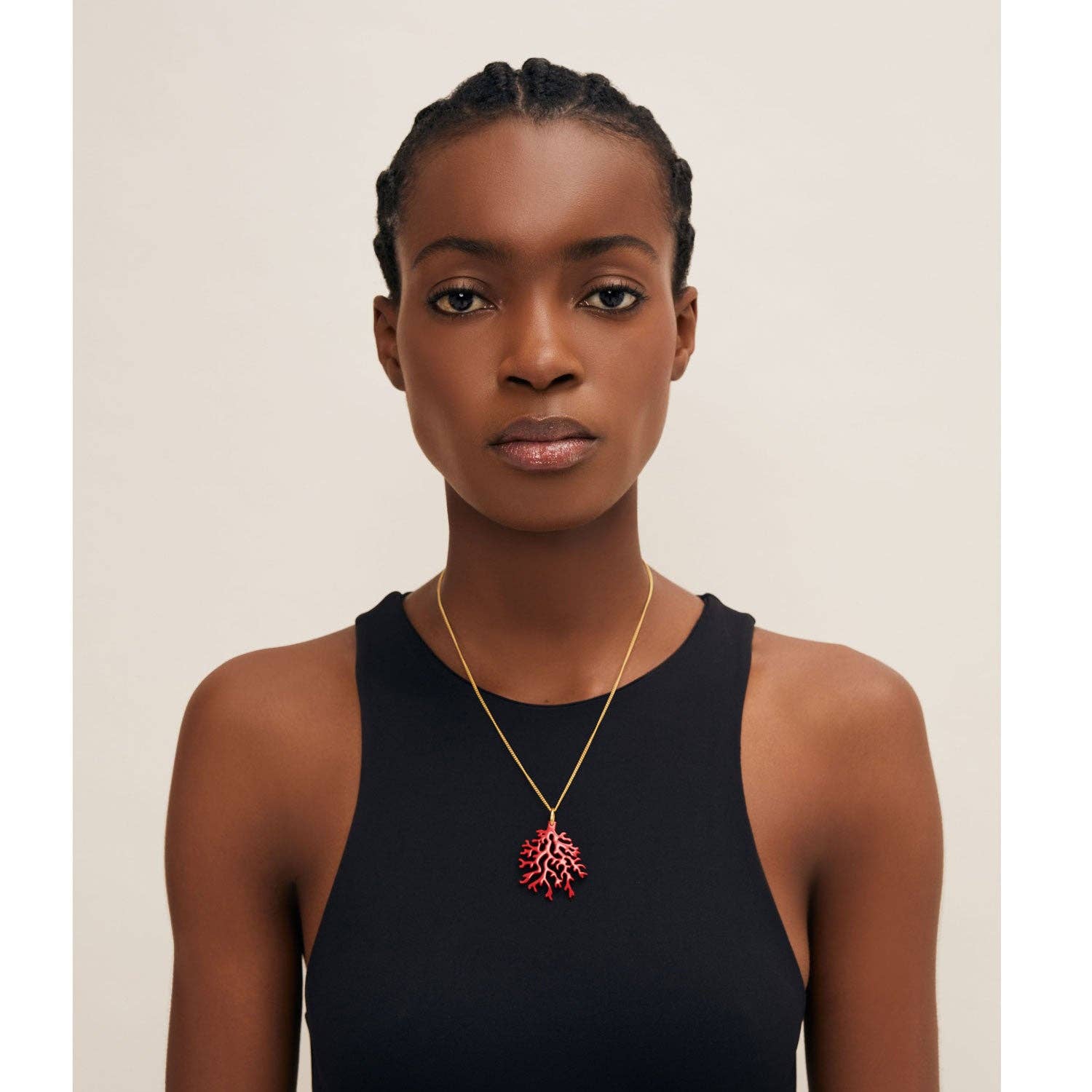 Natural ethically sourced horn has been intricately crafted by our very skilled artisans into a stunning coral shape, lacquered with a smooth coral coloured lacquer and set on a 20-inch gold plated silver chain.