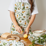 Luxury 'Spring Blossom' Apron on a green base, printed and made in the UK on 100% Organic Cotton.