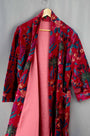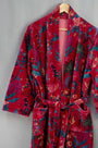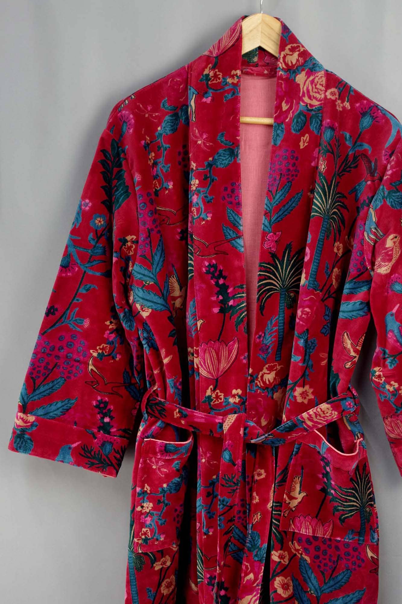 Velvet Kimono With Lining Gown - Maroon Red Tropical Floral