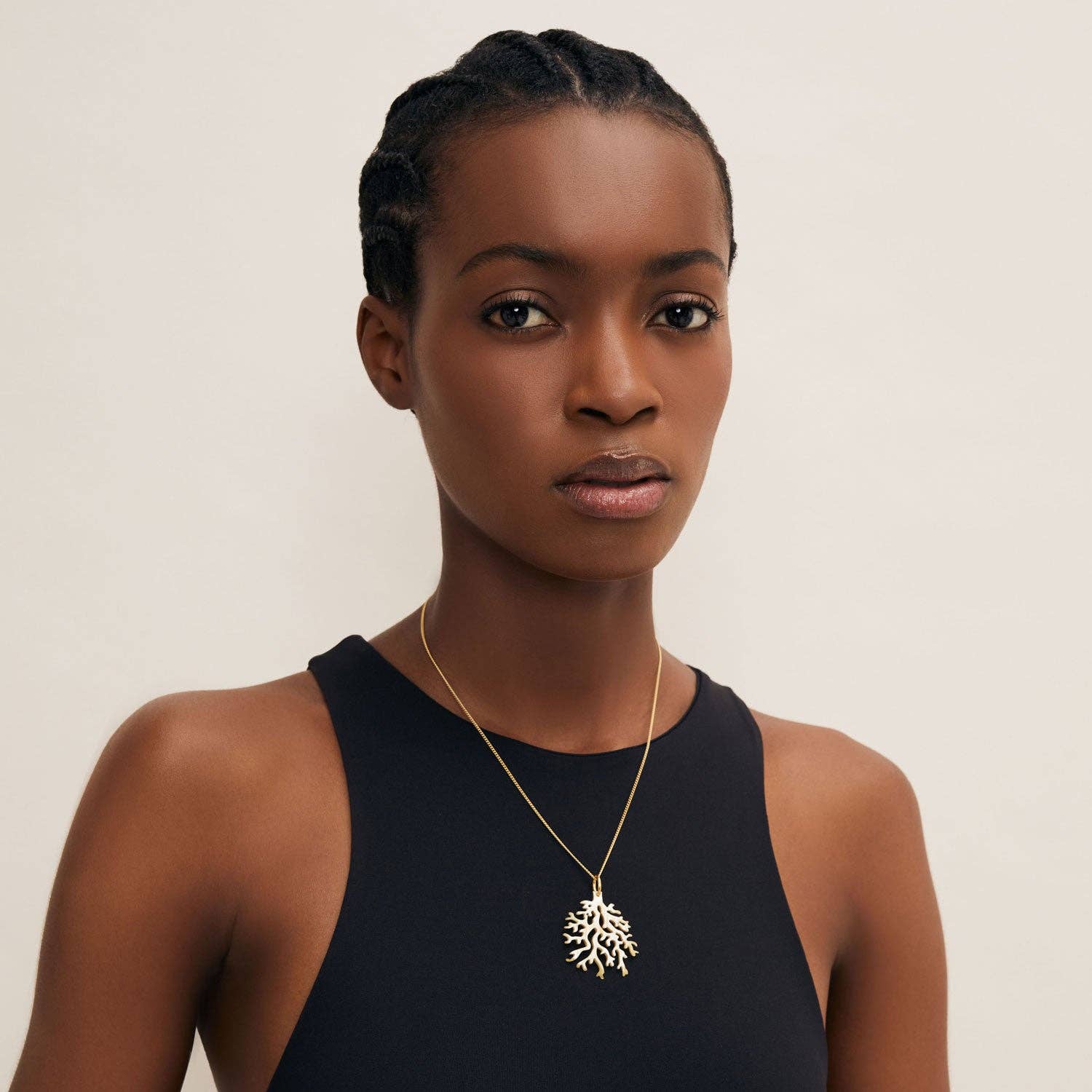 White natural ethically sourced horn has been intricately crafted by our very skilled artisans into a stunning coral shape and set on a 20-inch gold plated silver chain.